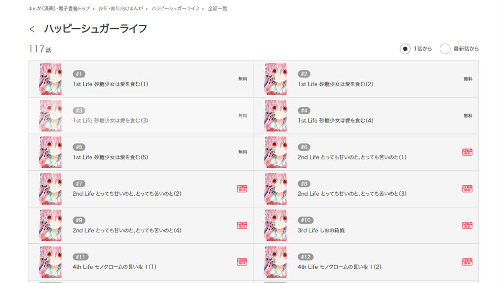『ハッピーシュガーライフ』を最安値で読みたい場合、複数の電子書籍配信サービスにまたがって購入することになります。